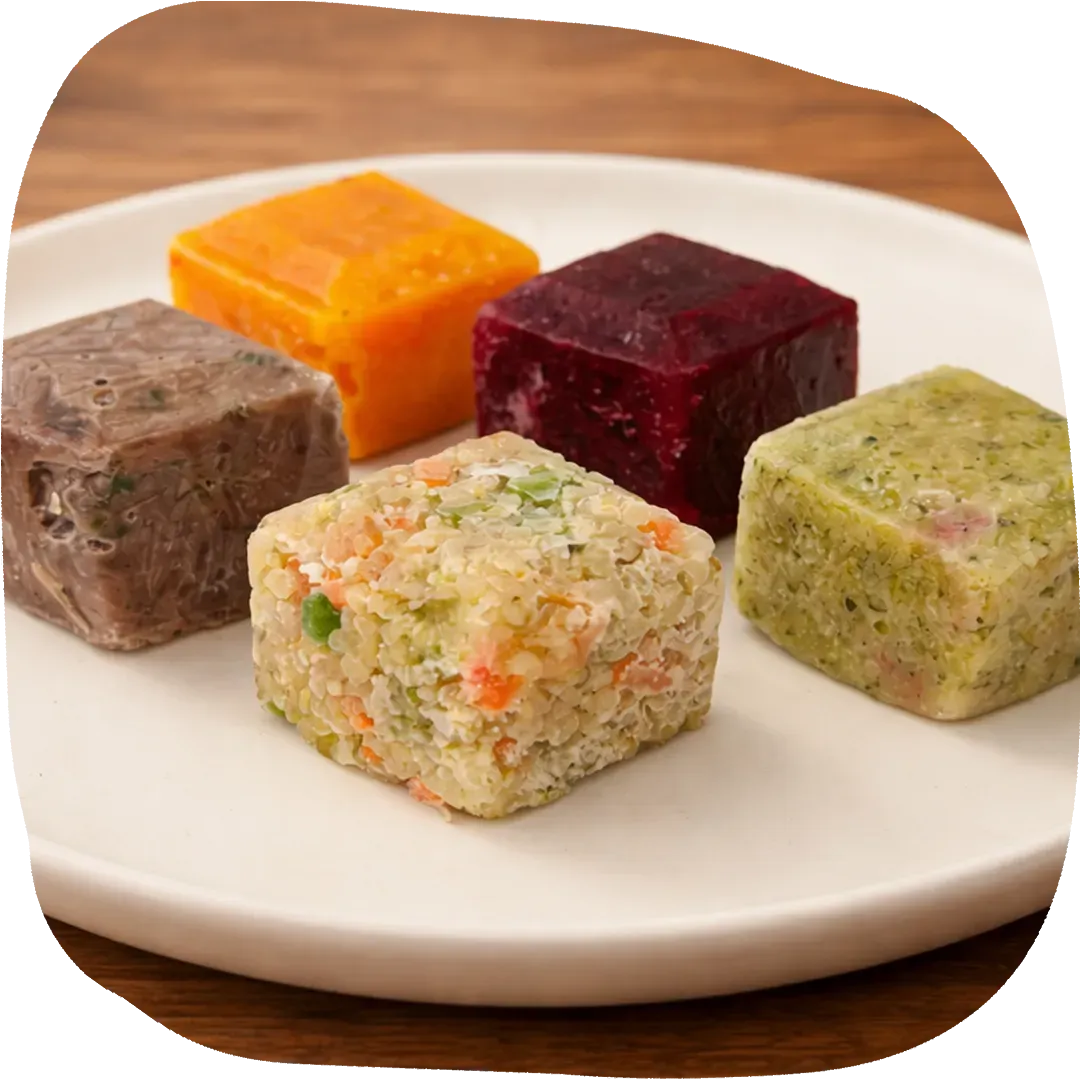 We researched, experimented and tested countless techniques and formats in order to develop the perfect balance: chef-crafted, nutritionist-approved, ultra-frozen nutrition, perfectly portioned into cubes.